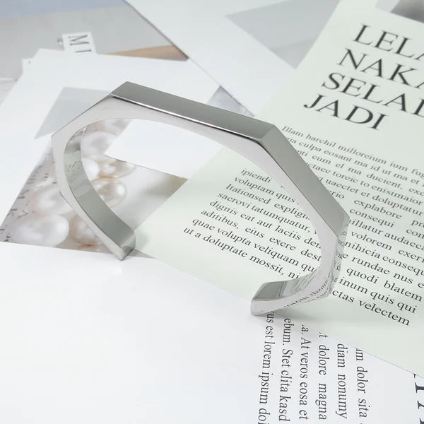 he Hexagon Cuff Bangle is a modern and unique piece that blends geometric design with elegant style. ✨